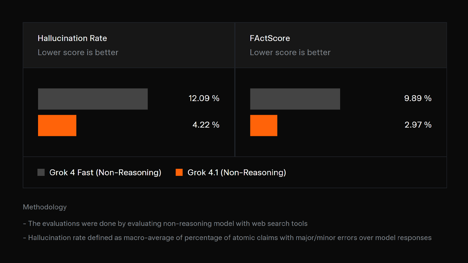 Một trong những thách thức lớn của các mô hình AI là hiện tượng hallucination – đưa ra thông tin sai lệch. Với Grok 4.1, xAI cho biết tỷ lệ này đã được giảm xuống chỉ còn 1/3 so với phiên bản cũ.