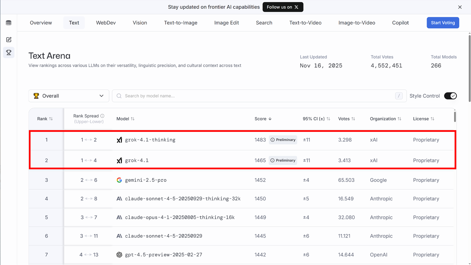 Grok 4.1 dẫn đầu bảng xếp hạng LMArena Text