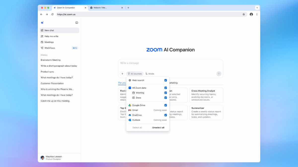 Về khả năng kết nối, AI Companion hiện đã có thể truy xuất dữ liệu từ các dịch vụ bên thứ ba như Google Drive và Microsoft OneDrive, bên cạnh dữ liệu được lưu trữ trực tiếp trên Zoom. Đại diện Zoom cũng xác nhận rằng việc tích hợp với Gmail và Microsoft Outlook sẽ sớm được triển khai, mở rộng khả năng xử lý email và lịch làm việc trong thời gian tới.